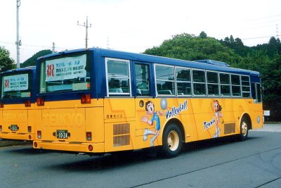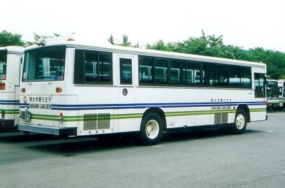 | 平成15年3月に納車された車両は、富士重工バス製造撤退のあおりを受け、今回から西日本車体工業製ボディーを架装した車両になりました。13年に納車された富士重工車と同様に、前中引戸、ツーステップ、ビルトインクーラー、逆T字アウターガラス装備となりましたが、リーフサスの設定が無くなった為、エアサス装備となりました。現在2両が在籍しています。 | |